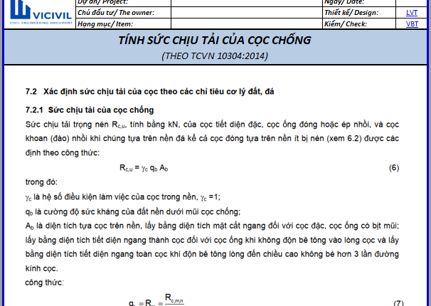 | Title | TÍNH SỨC CHỊU TẢI CỌC CHỐNG – TCVN 10304:2014 |